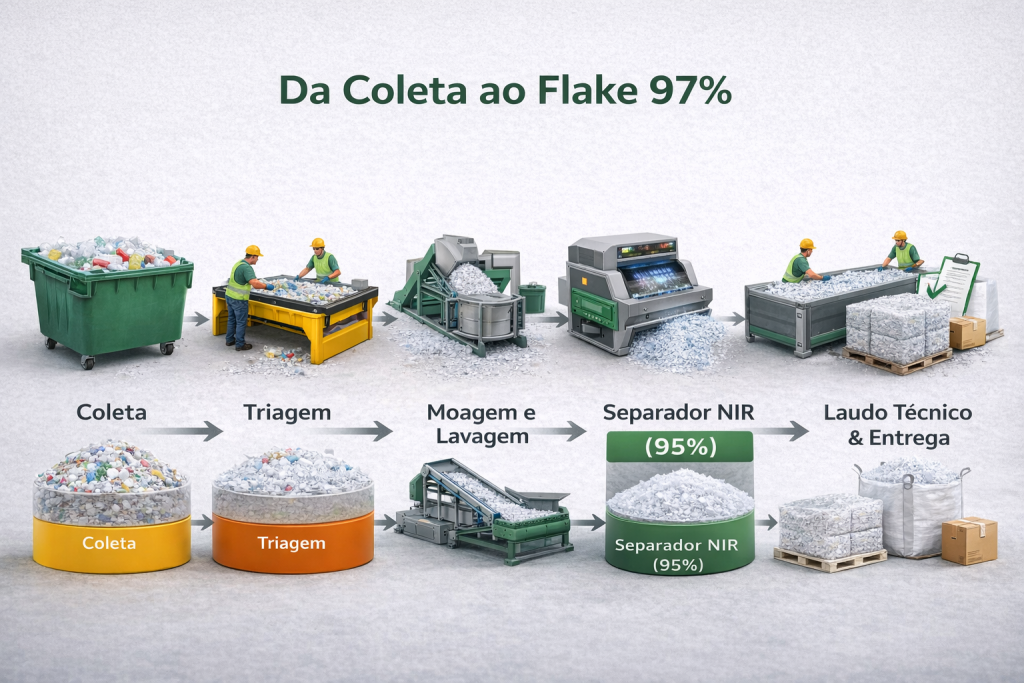 Nenhum processo atual consegue atingir 100% de pureza em flakes pós-consumo. Isso vale para qualquer reciclador no mundo.