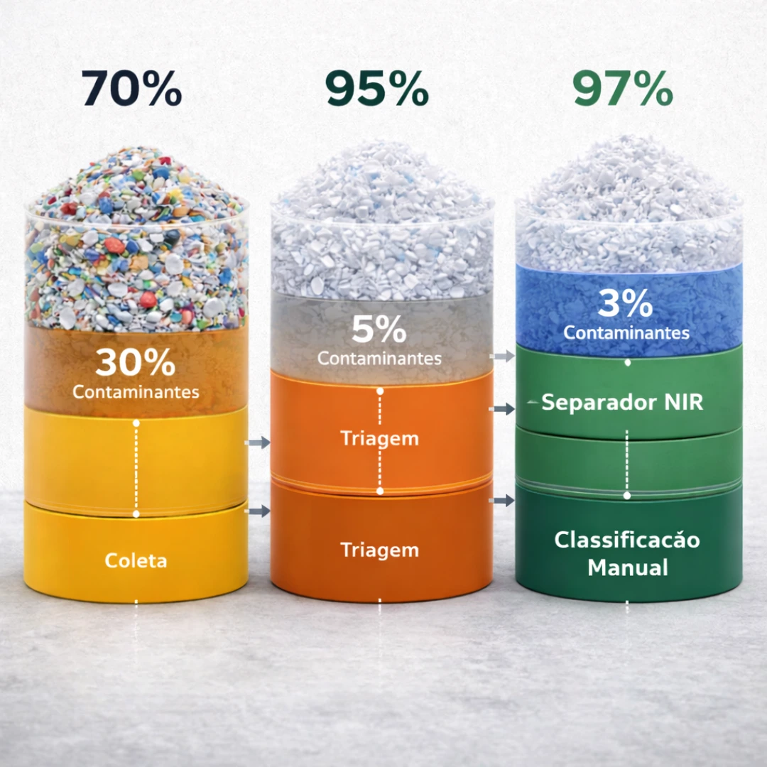Por isso, o índice de 97% representa o estado da arte para flakes pós-consumo produzidos com processos rigorosos. O comprador deve questionar fornecedores que afirmam entregar 100% — porque esse dado não resiste a uma análise laboratorial.
