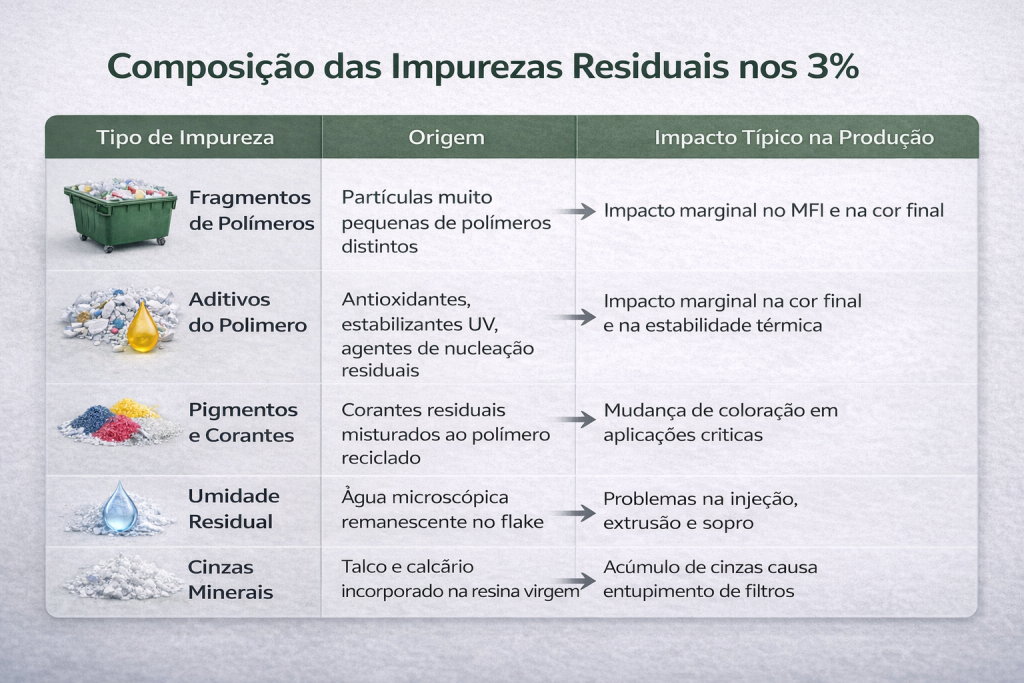 Portanto, parte dos 3% não são impurezas no sentido estrito. São componentes inerentes ao ciclo de vida do polímero pós-consumo. Dependendo da aplicação, esses elementos têm impacto negligenciável na performance do material.