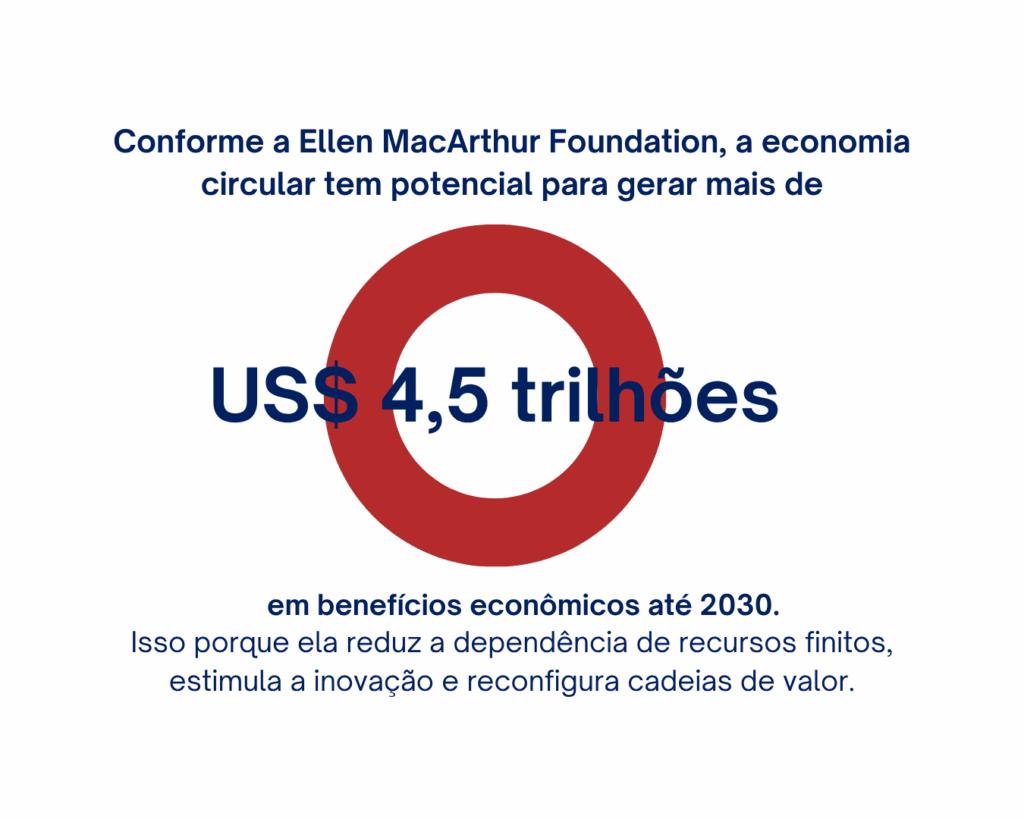 Conforme a Ellen MacArthur Foundation, a economia circular tem potencial para gerar mais de US$ 4,5 trilhões em benefícios econômicos até 2030. Isso porque ela reduz a dependência de recursos finitos, estimula a inovação e reconfigura cadeias de valor.