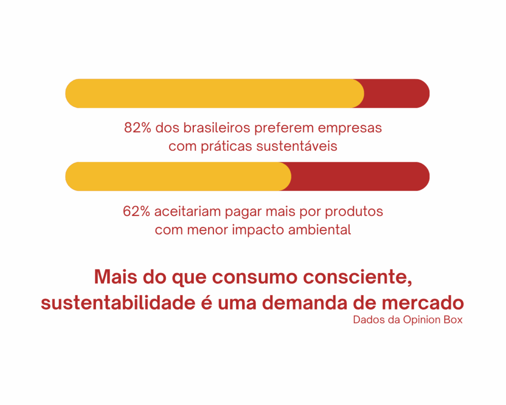Sustentabilidade não é mais diferencial: é obrigação. Dados da Opinion Box mostram que 82% dos brasileiros preferem empresas com práticas sustentáveis, e 62% aceitariam pagar mais por produtos com menor impacto ambiental. Em outras palavras, mais do que consumo consciente, é uma demanda de mercado.