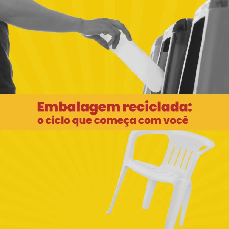 Então, essa embalagem é coletada, separada, lavada, triturada e transformada em flakes e depois, resina reciclada. Essa resina volta para a indústria e vira nova embalagem, produto ou até parte de móveis, brinquedos ou materiais de construção.